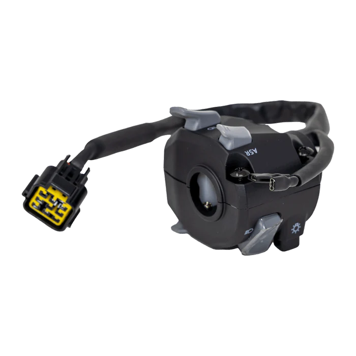 Stock left multifunctional control assembly including high beam, headlight control, ASR traction control, horn, reverse selector, and kill switch. Ultra Bee models 2024 and earlier.