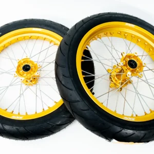 The standard Warp9 17″ Supermoto Wheelset at SurronPart.com includes: